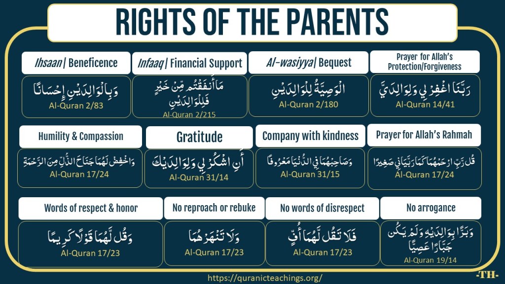 Islam emphasizes concern for parents’ rights, obedience and charity. God ordered 17 times in the Bible to be kind to them, and the love of the parents is linked to the worship of God